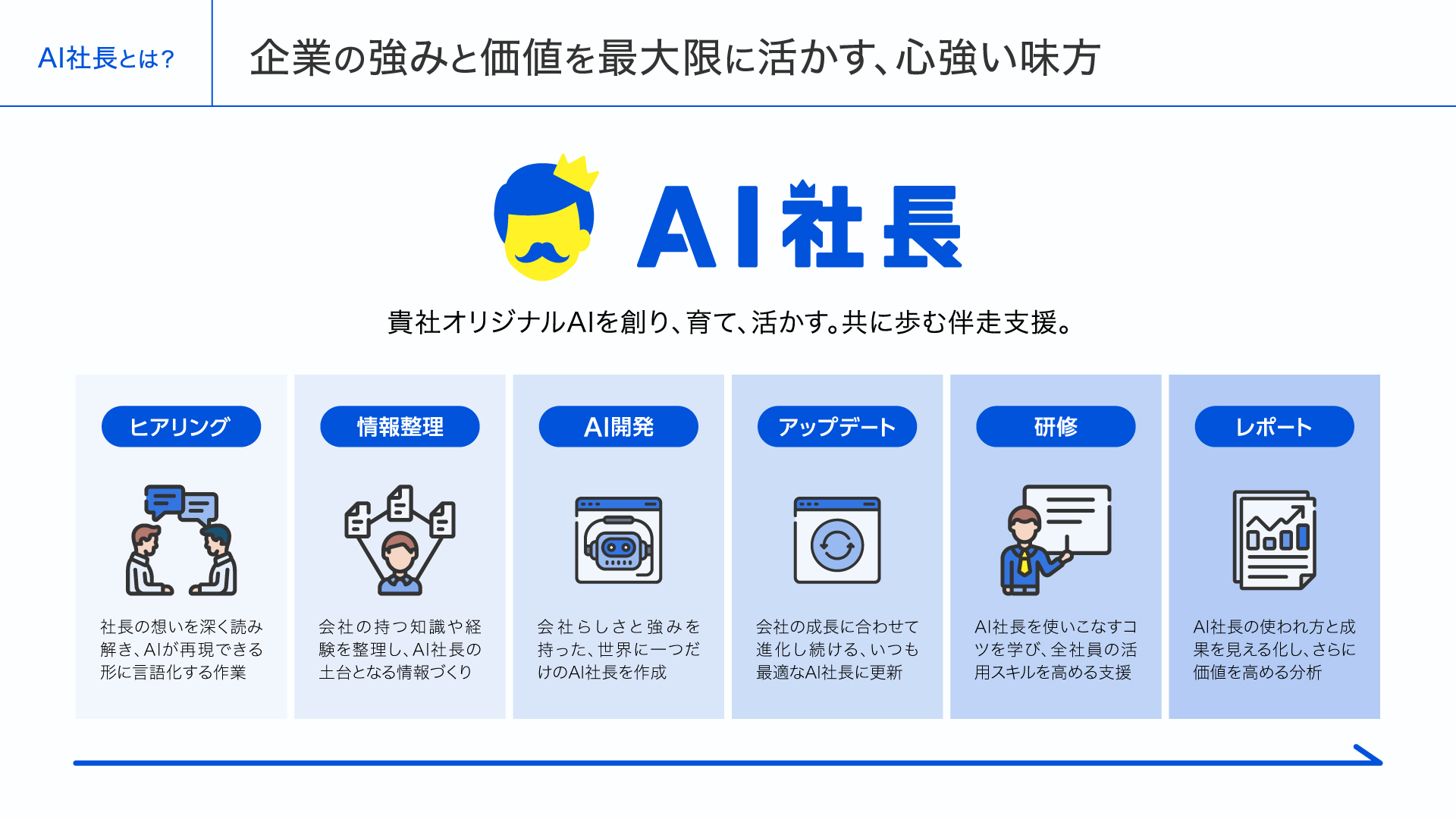 ・中小企業の持続的成長を支援:単なる業務効率化を超え、社員の働きがいや心の支えとしても機能し、企業独自の競争優位性を保ちながら持続的成長を支援する「理念を生きた判断基準に変える」AIパートナーです。