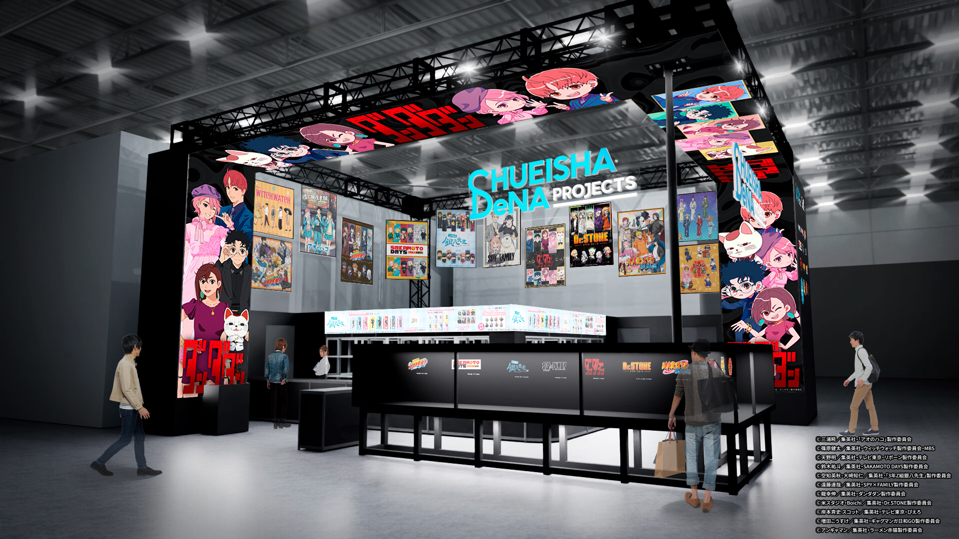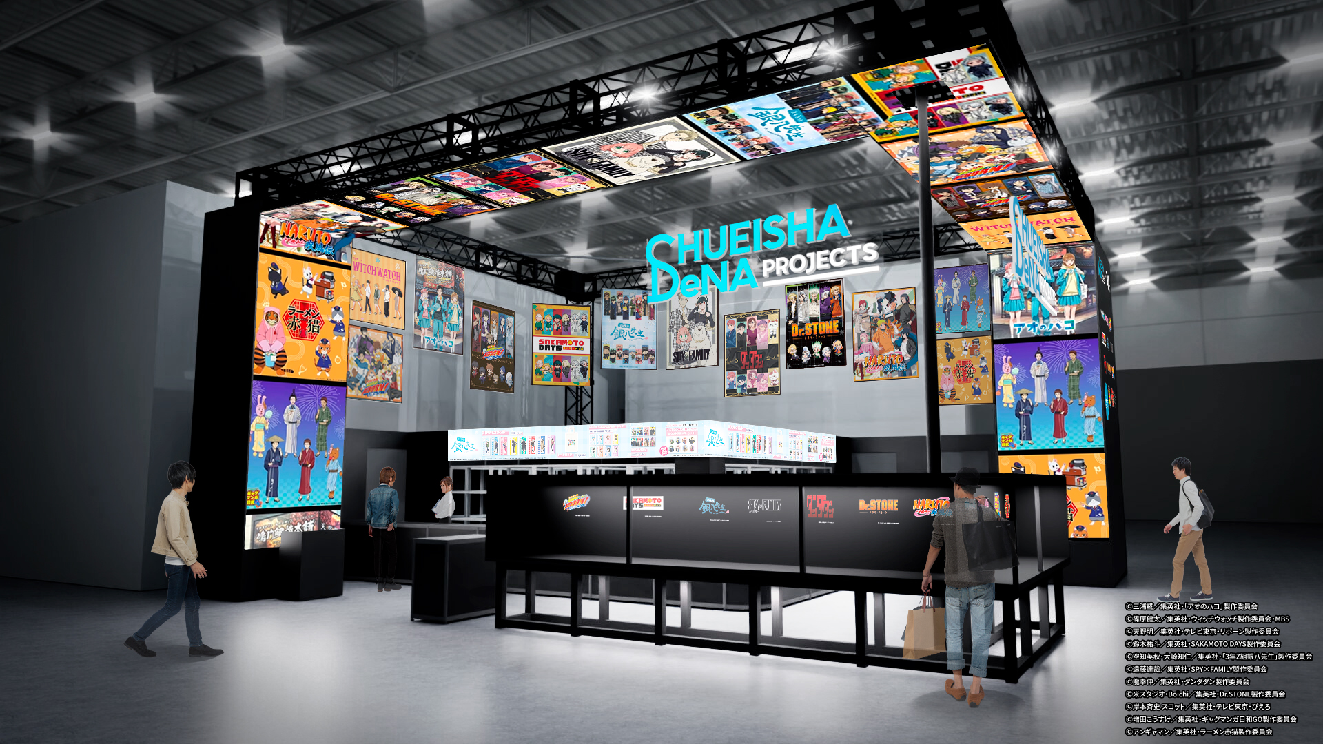 今回出展するブースは、集英社DeNAプロジェクツとDeNAの共同企画による、アニメ作品×デジタルクリエイティブをテーマにしたグッズショップです。全面的に配置した大型LEDパネルを用いて、ジャンプアニメ作品のビジュアルでブースを彩り、来場者にワクワクをお届けします。