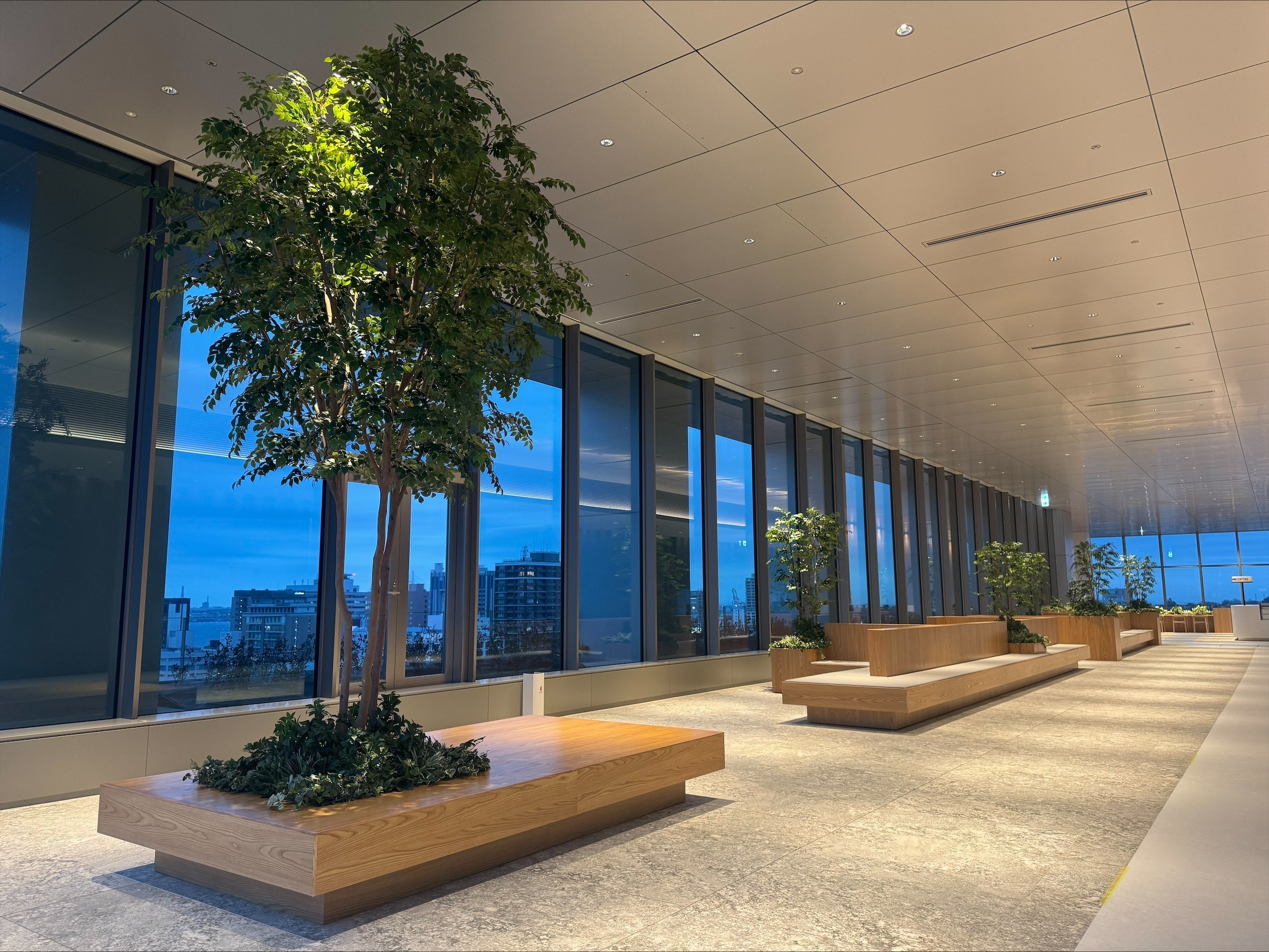 環境面では、Low‑E複層ガラス(※1)、高効率の個別空調システム、熱を再利用する外気処理システムなど、多様な環境配慮設備を導入し、快適性と省エネルギー性を両立しています。こうした取り組みにより、建物の環境性能評価として CASBEEスマートウェルネスオフィスSランク(※2)およびZEB Oriented(※3)を取得しています。季節を問わず快適に過ごせる室内環境を保ちつつ、エネルギーの無駄を抑える建物性能を実現しています。